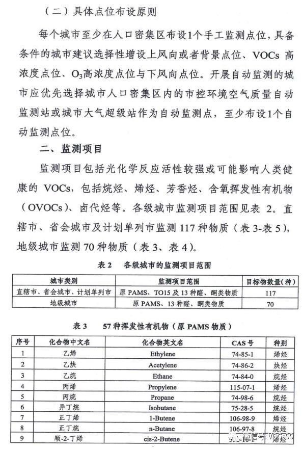 監(jiān)測項目包括光化學反應活性較強或可能影響人類健康的VOCs,包括烷烴、烯烴、芳香烴、含氧揮發(fā)性有機物(OVOCS)、鹵代烴等。各級城市監(jiān)測項目范圍見表2。直轄市、省會城市及計劃單列市監(jiān)測117種物質(zhì)(表3-表5),地級城市監(jiān)測70種物質(zhì)(表3、表4)。
